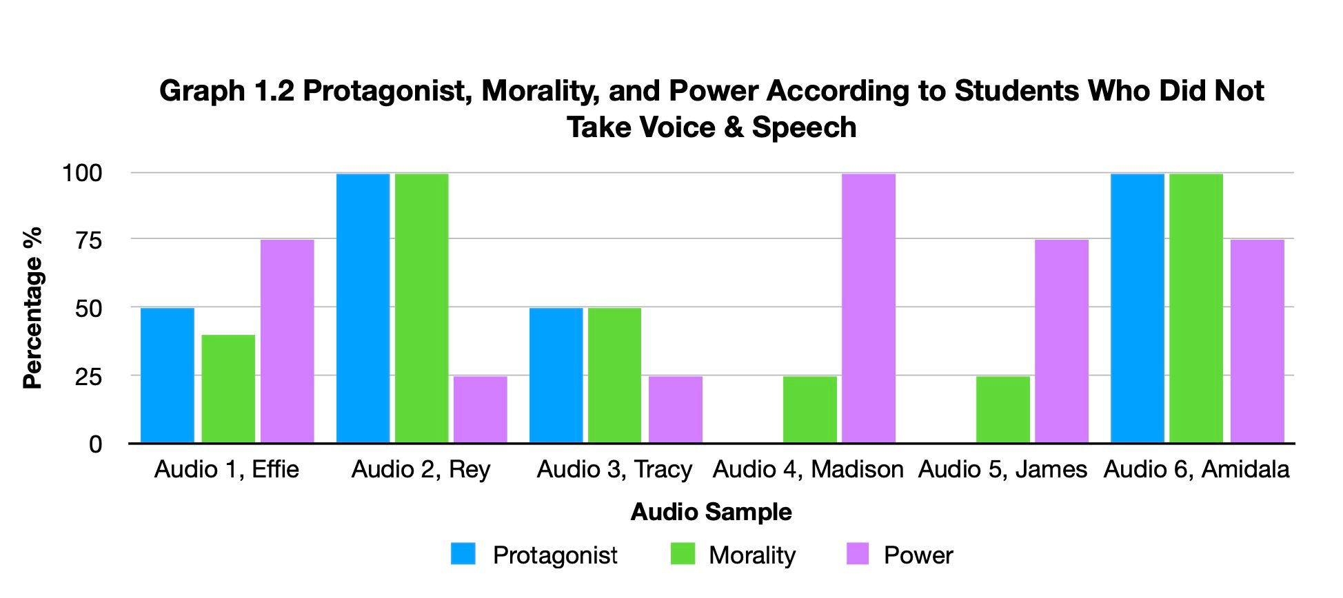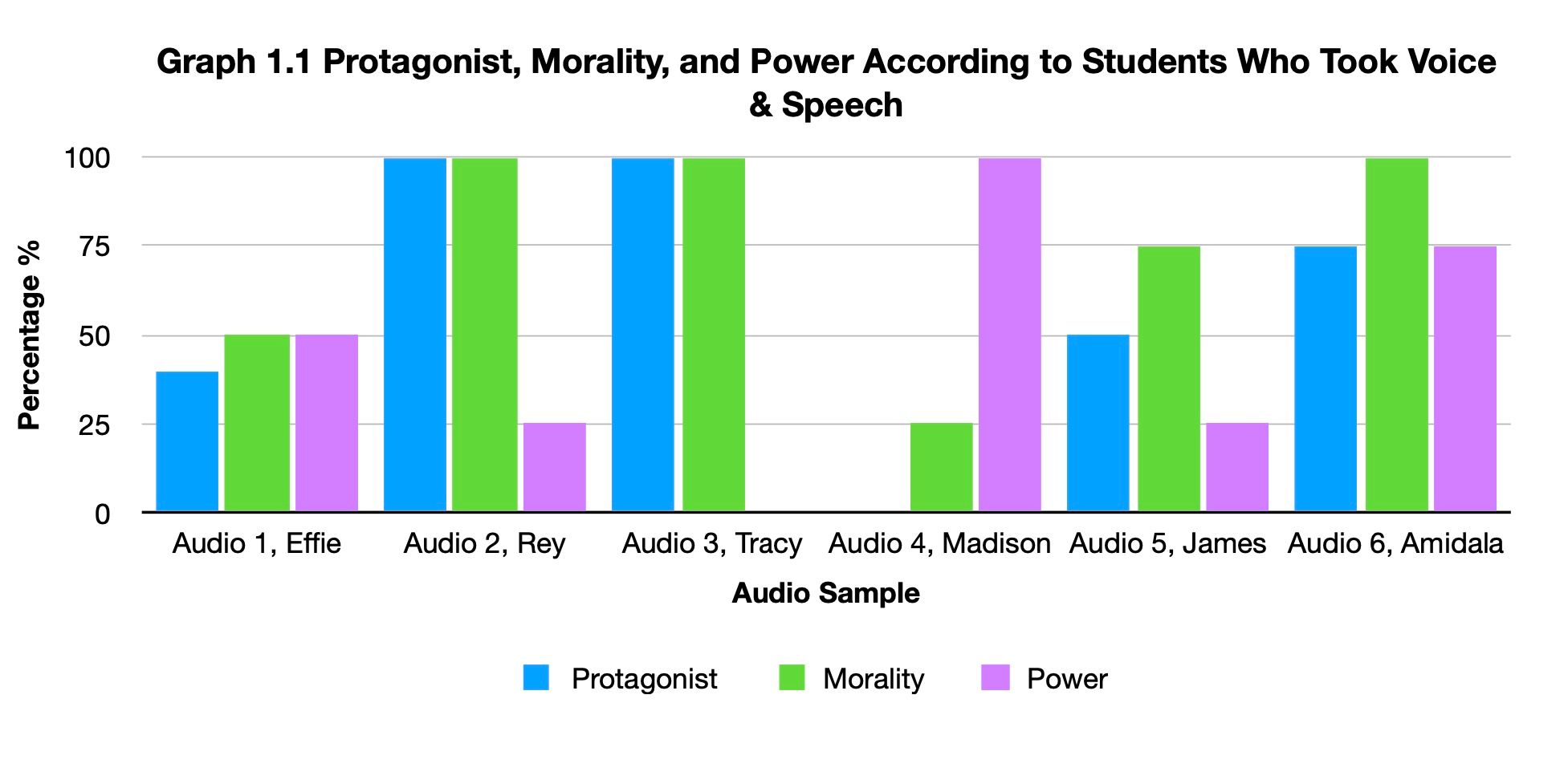 Once we received completed surveys from all of our informants, we sorted our data by audio and respondent in order to isolate responses. We looked at which informants took Voice & Speech and which didn’t and separated that data. We choose to highlight the questions regarding protagonist qualities, morality, and power as character traits that can be highlighted by language.