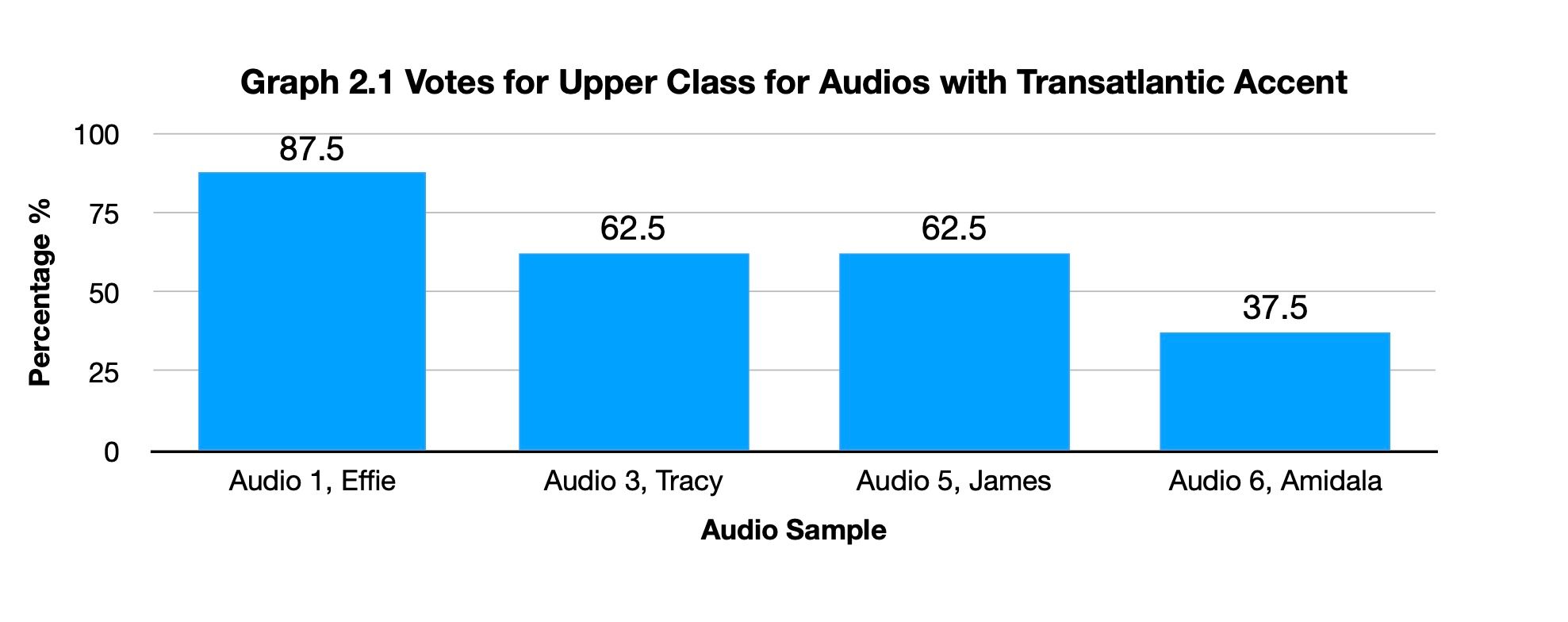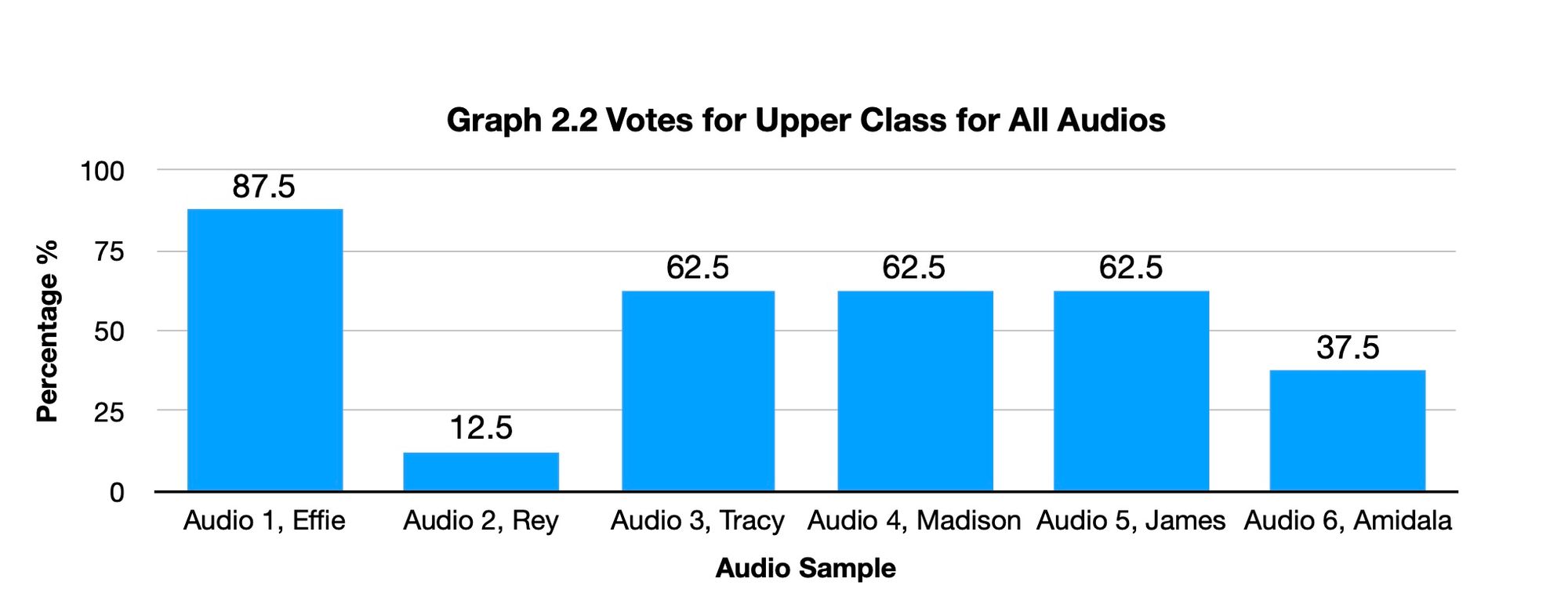 Graphs 2.1 and 2.2 above depict the percentage of listeners that marked each character as “Upper Class” when asked about socioeconomic status. This sample was taken from both students who did and did not take Voice & Speech to get a picture of how all informants were responding to status implications. Graph 2.1 shows only the audios that use the transatlantic accent while Graph 2.2 shows all of the audios side by side, giving us a picture of the comparison. Two-thirds of the characters were predominantly seen as Upper Class, even Madison, who was our AmE control. It was surprising that Rey, our BrE control was seen as the least Upper Class since the standard British accent is typically received as posh and sophisticated. Interestingly, in the context of the whole film, Queen Amidala (Audio 6) only uses the transatlantic accent once she becomes Queen. Yet, our informants mostly saw her as middle class with the transatlantic accent. Effie is seen most often as high class, but almost all participants recognized her from the audio so they were likely influenced in their answers.