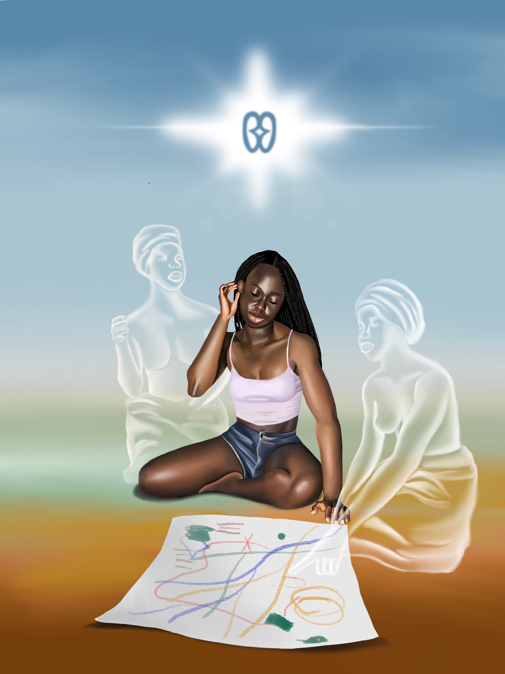 Artist statement: An illustration of me reading a map with two ancestral spirits guiding me. Above there is a star with a Ghanaian adinkra symbol which symbolizes hope and inspiration because learning about my heritage has been a very long, but also fulfilling and inspiring journey for me as an artist.