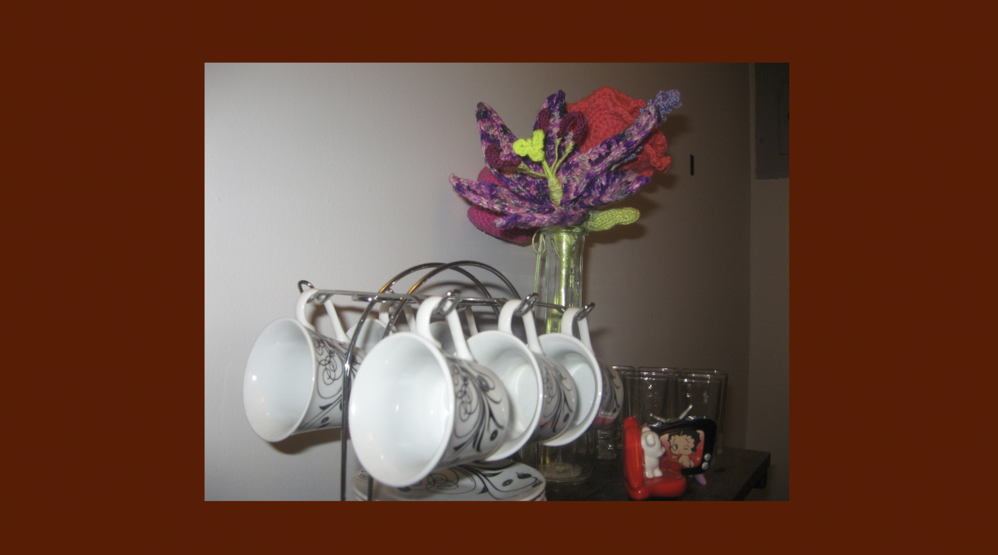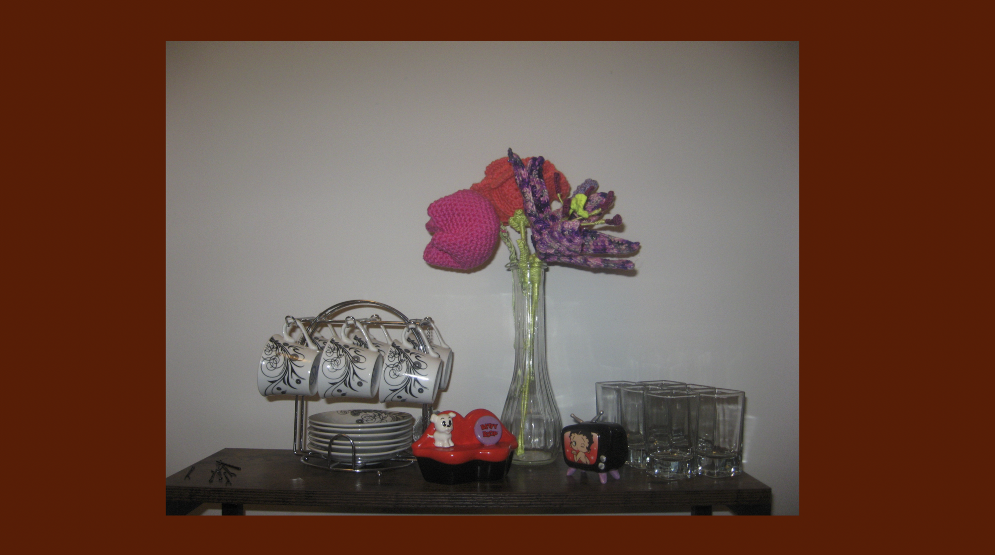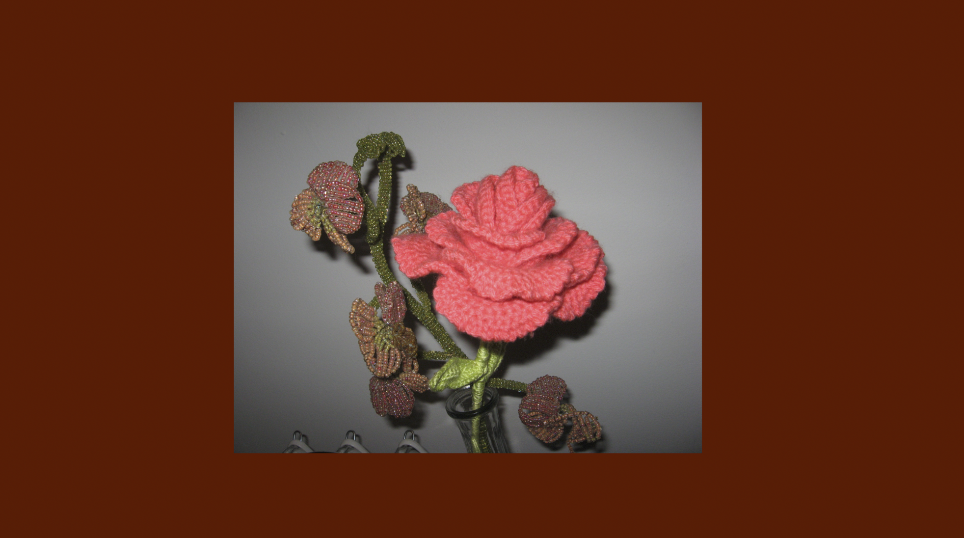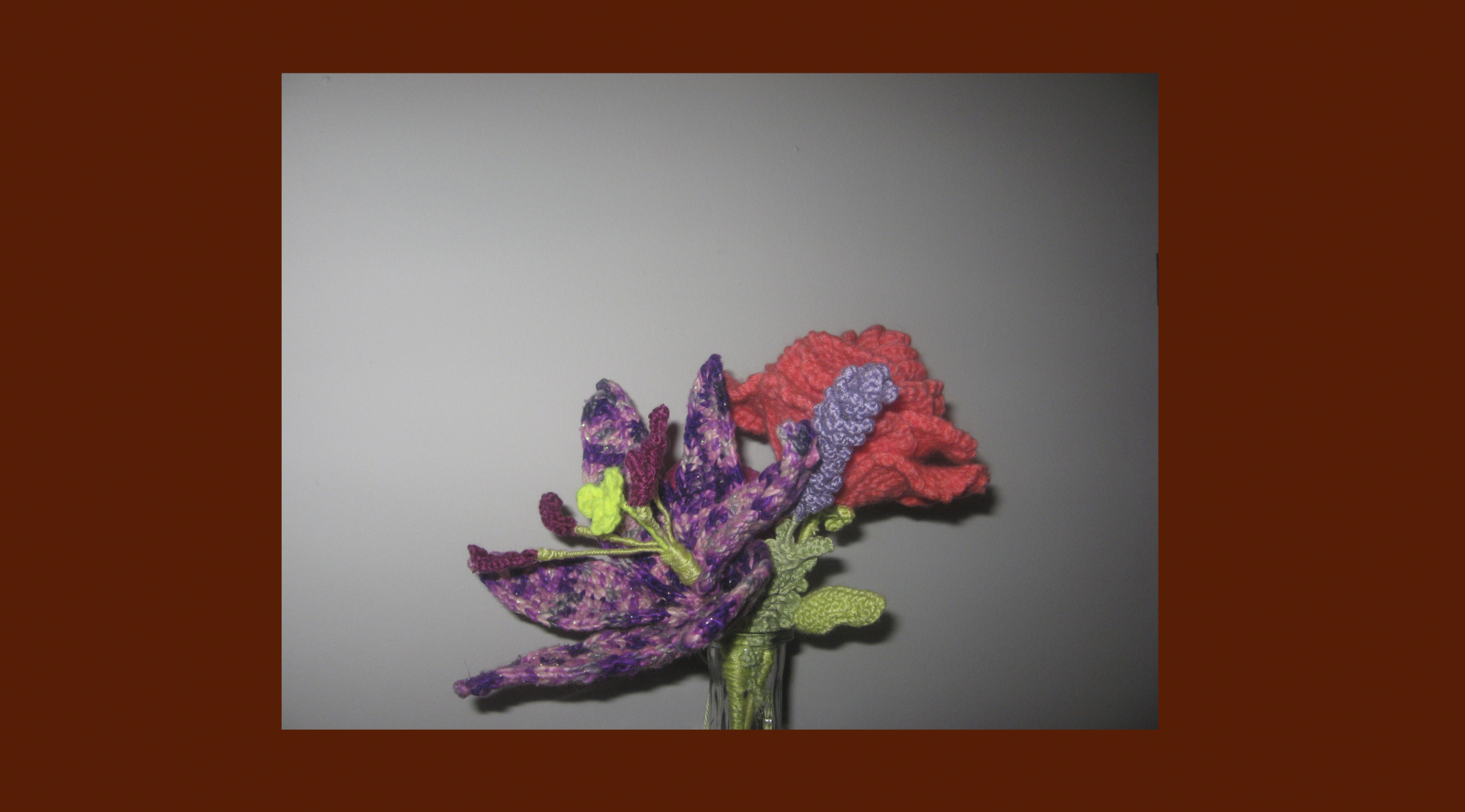 Photographs of my flower collection that grows over time, just not in length. They were made through crochet, which is my favorite art form because it keeps my hands busy, relieving my stress. Crocheting is the ultimate artistic medium to me because it acts as both a fidget toy and an adaptable, funky