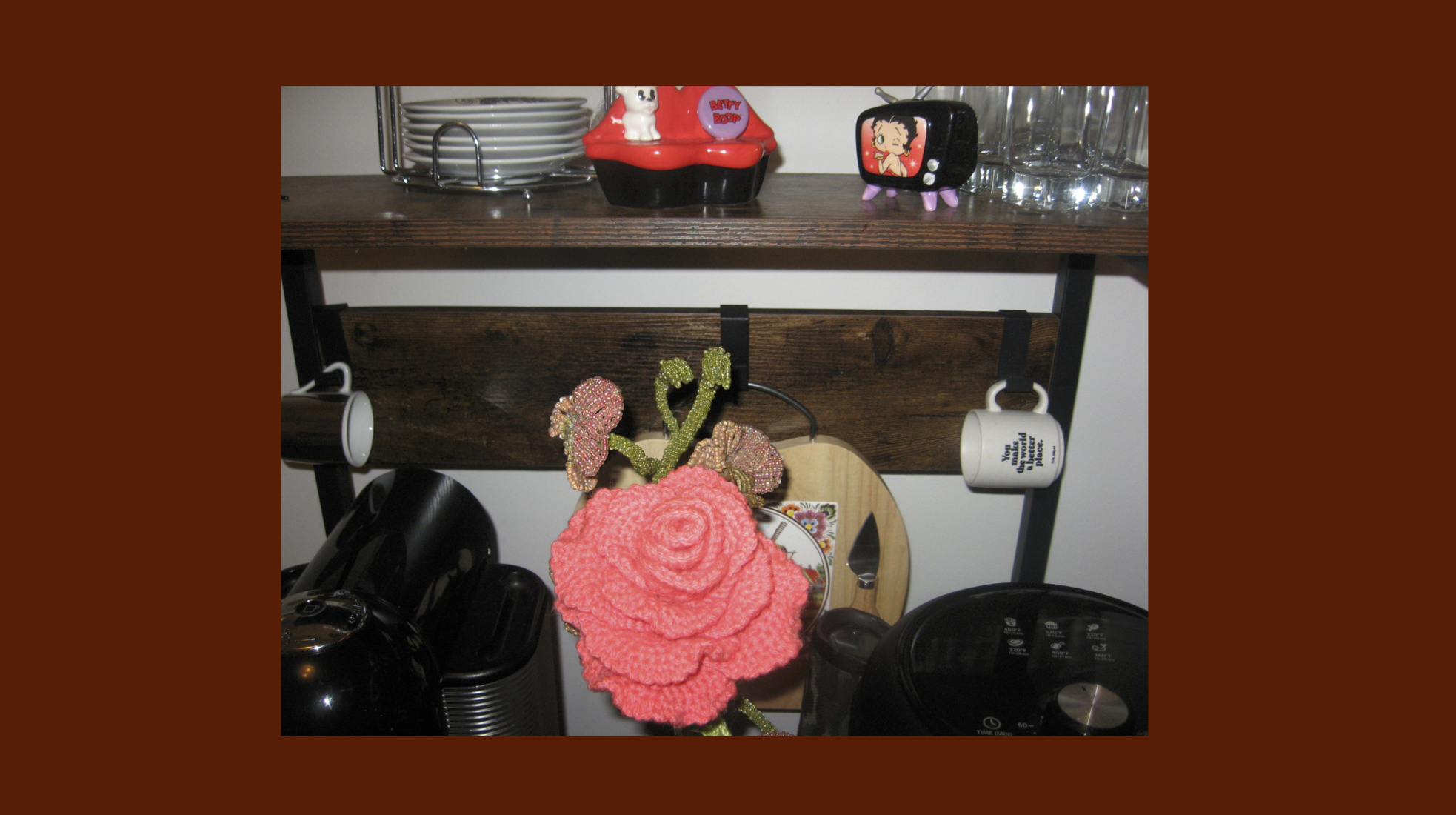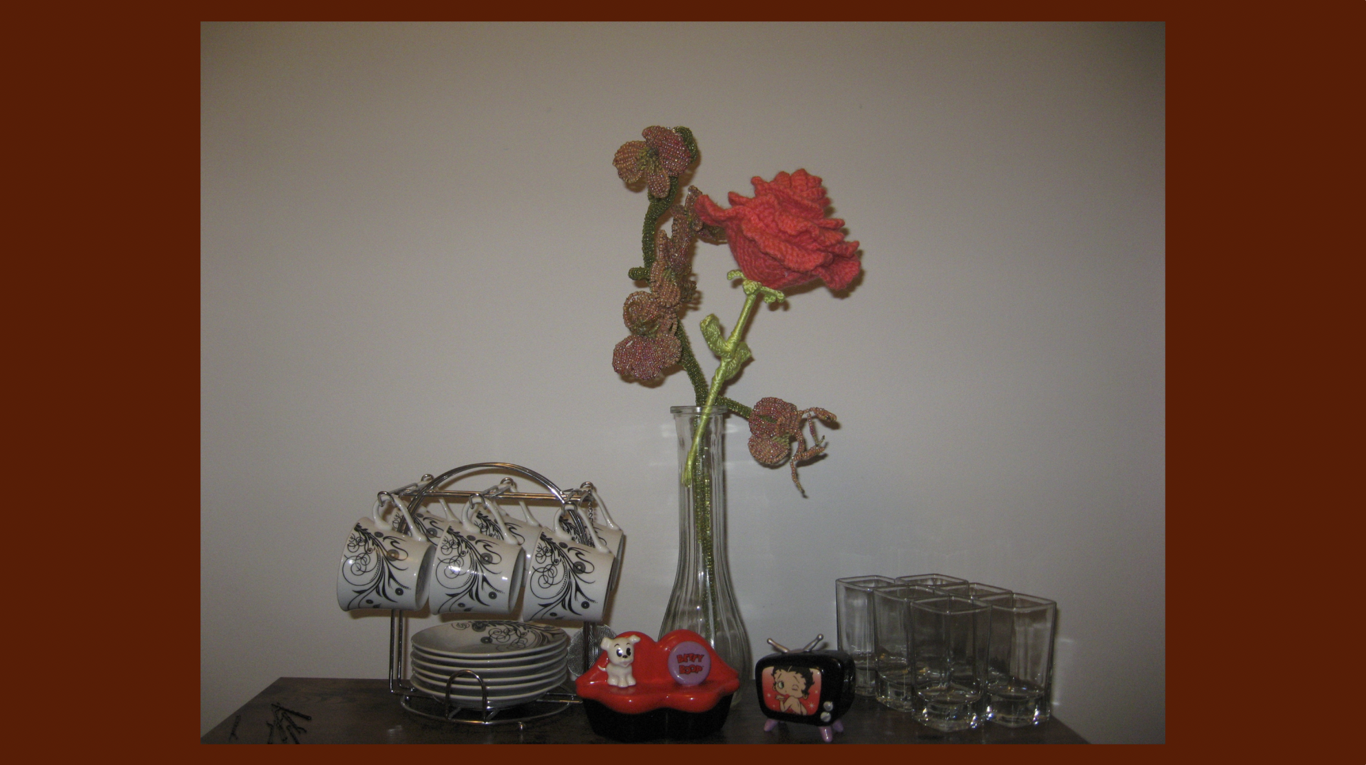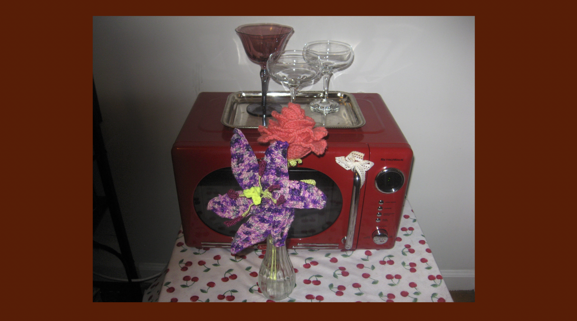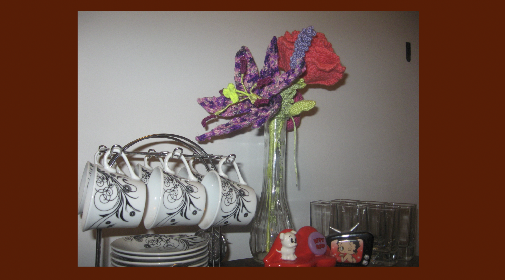Photographs of my flower collection that grows over time, just not in length. They were made through crochet, which is my favorite art form because it keeps my hands busy, relieving my stress. Crocheting is the ultimate artistic medium to me because it acts as both a fidget toy and an adaptable, funky