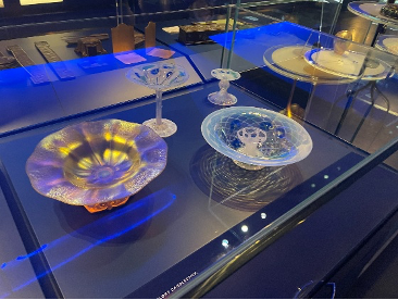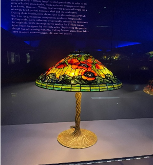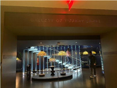 The middle of the exhibit has a glowy staircase leading to even more intricate and beautiful designs While the bottom floor tells the story of Tiffany and the women who mostly created his lamps. The top floor doesn’t have as much information. most of your focus will be on into focusing on these designs. The light illuminating from these objects creating a kaleidoscope of colors. The closer you get to it the more details you notice. The more you stare the more in awe. Tiffany and Driscoll heavily drew inspiration from nature, so strolling in between these lamps and objects felt like walking through a garden- serene and masterfully built.