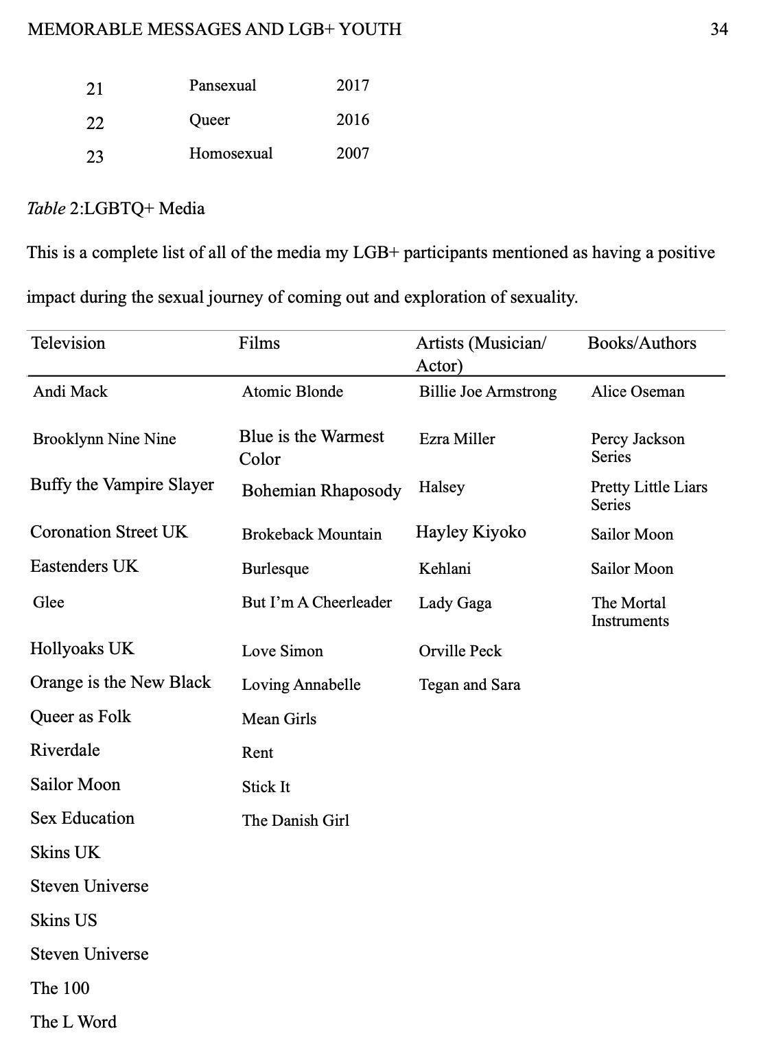 I believe conducting my study through a survey may have benefited my research because this should allow participants to take their time with the questions and be in a more comfortable position to respond to such sensitive subject matter in private. This should allow more openness and honesty that will yield more insightful answers because there is no pressure from being interviewed. The first step of my analysis is to divide participants' responses up by sexuality so see if this impacted participants' responses in any way. The responses will be divided up by similarities in themes of the memorable messages participants recalled. Lastly, I will have a breakdown of the different types of media provided by my participants and why it proved influential for them. To see the full range of sexualities observed and a list of media participants mentioned, refer to the table in Appendix B. I will be looking for correlations between memorable messages between participants to understand what made them so impactful. Through my analysis of what my LGB+ participants recount about the media and their coming out experiences, I will be able to understand the answers to my research questions and from that better understand the landscape of the media that exists with an understanding of how to successfully better it in the future.