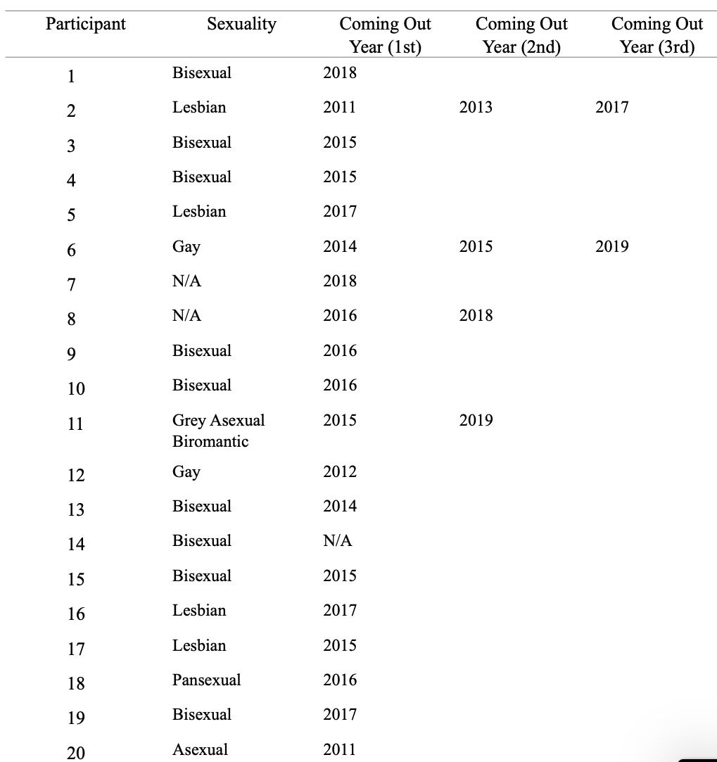 I have included Coming out 2nd and 3rd years because many LGBTQ+ youth may come out in stages or have to come out multiple times for various reasons from finding an orientation they better identify with to having to come out multiple times to be validated and understood.